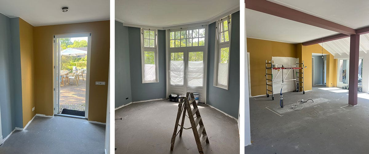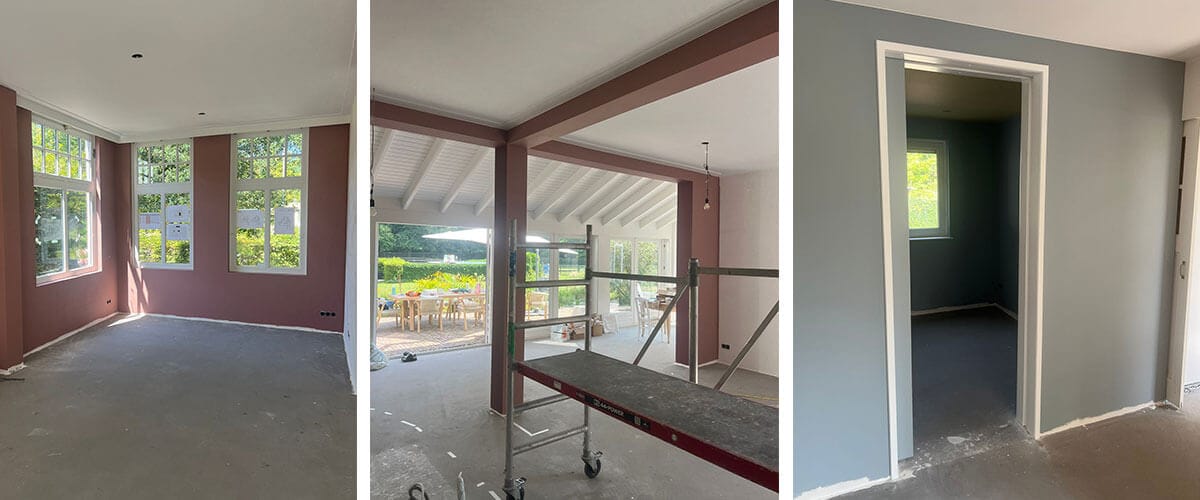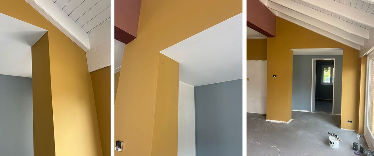 In de leefruimte kozen we voor diepe roze accenten die perfect combineren met het natuurlijke lichtinval en de witte plafonds. De doorgang naar de keuken kreeg een stijlvolle okergele afwerking, strak afgewerkt tot in de puntjes. Ook de hal en slaapkamers mochten niet achterblijven: daar brachten we een rustige grijsgroene tint aan, die zorgt voor een moderne, maar warme uitstraling.